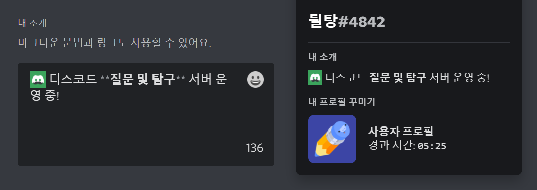 글씨를 굵게 하고픈 부분 양 옆에다가 별표 2개(**)를 입력해주세요. 그러면 그 사이 부분이 굵은 글씨로 변하게 됩니다! 이렇게 양쪽에 특정 기호를 넣어 글자를 꾸미는 방식을마크다운이라 부릅니다.이 방법은 채팅에서도 쓰실 수 있지만, 프로필의 내 소개를 꾸며줄 때나 모바일에서 굵은 글씨를 입력하고 싶을 때 유용합니다.