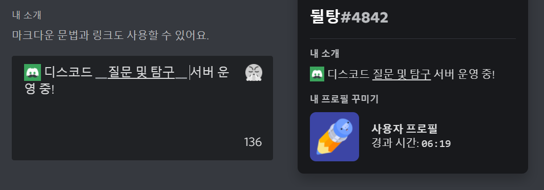 디스코드에서 글씨에 밑줄을 긋고 싶으시면 해당 범위 양 옆에 언더바 2개(__)를 붙여주세요. 그럼 위 사진처럼 밑줄이 그어지게 됩니다. 이런 식으로 양쪽에 기호를 넣어 글자를 꾸미는 방법을 마크다운이라 부릅니다. 이 방법으로 다음과 같이 프로필의 내 소개를 꾸며주실 수 있습니다.