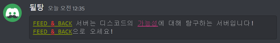 디스코드에서 글자색은 주로 코드 블럭을 통해 편법으로 입력됩니다. 위와 같이 코드 블록으로 입력한 내용에 밑줄을 긋고 싶다고 해봅시다.