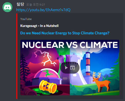 디스코드에서도 마찬가지로 링크를 올리면 embed 형식으로 미리 보기가 주어지는데요, 이 미리보기의 내용을 바로 meta에서 가져오는 것이랍니다. 따라서 meta의 내용을 바꿔주면 미리 보기의 내용을 바꿀 수 있지요. 지금의 경우는 동영상은 그대로 두고 사진만 바꾼겁니다.