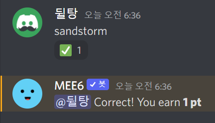 맞는 답을 입력하셨으면 반대로 아래에 체크모양 이모지(✅) 반응이 달리게 됩니다. 또 얻은 점수를 MEE6 봇이 말해줍니다.