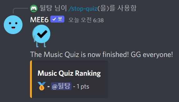 음악 퀴즈는 15곡을 모두 들으면 자동으로 끝나게 됩니다. 혹시 더 일찍 끝내고 싶으시면 /stop-quiz 명령어를 쳐주세요. 그럼 바로 끝내실 수 있습니다. 퀴즈가 끝나면 최종 순위표가 아래에 나오게 됩니다!