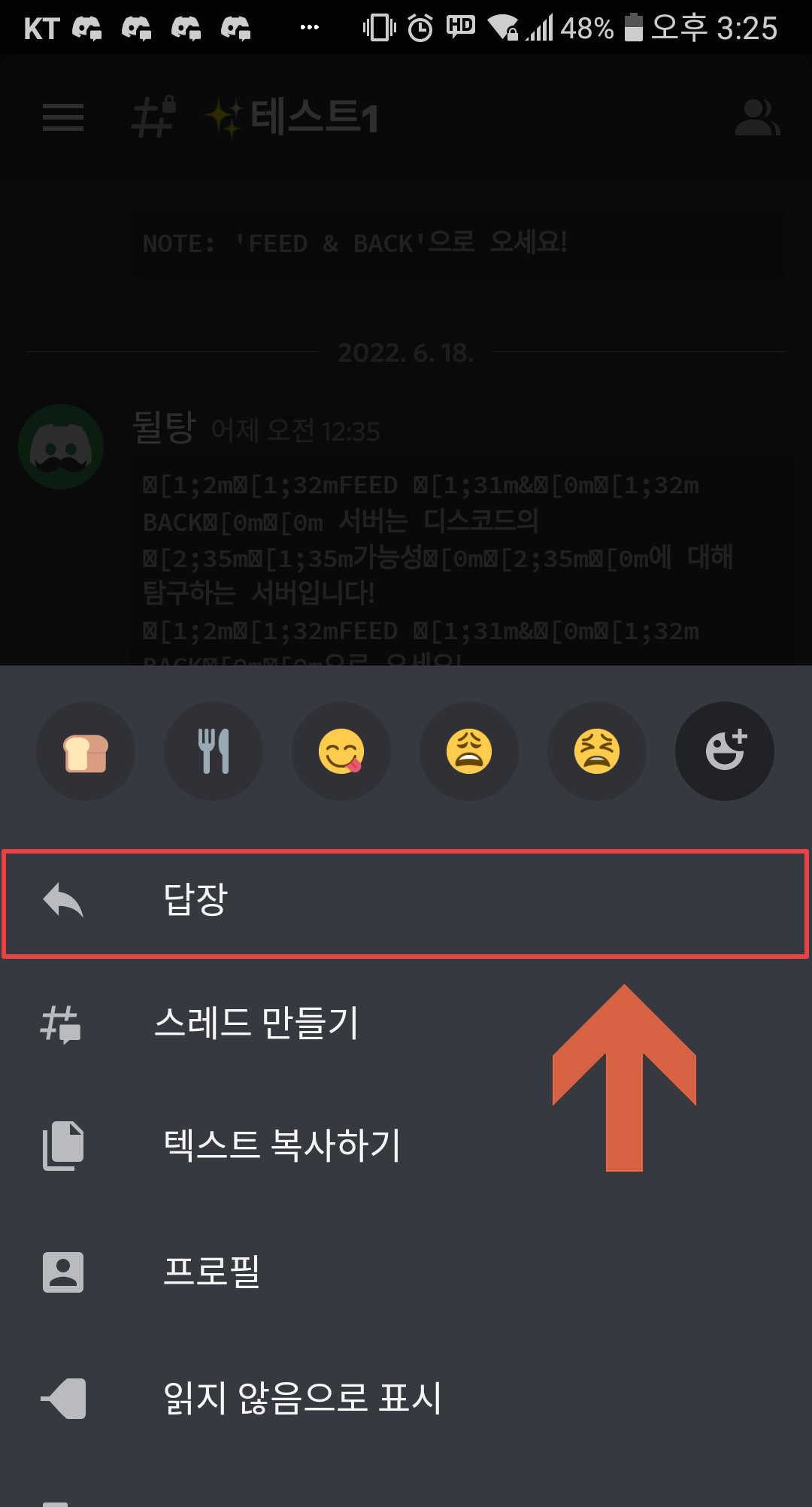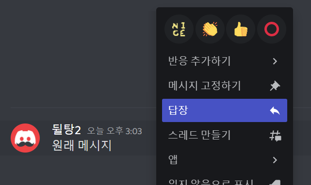 혹은 메시지에 우클릭을 하셔서 메뉴를 열어 답장을 클릭하셔도 됩니다!