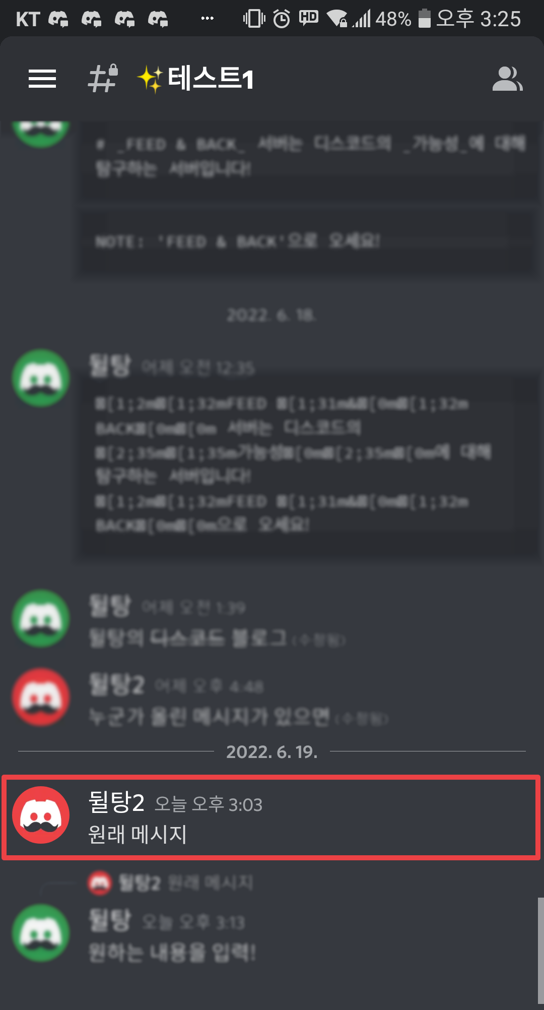 그럼 다음과 같이 해당 메시지로 이동하게 됩니다! 이러한 기능은 뒤에 있던 내용을 다시 앞으로 불러오고 싶을 때 유용하겠지요!