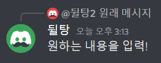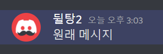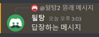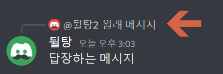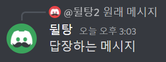 디스코드에서 답장은 위와 같은 형식으로 보이게 됩니다. 위에는 원래 메시지의 내용이 보낸 사람 이름, 프사와 함께 표시됩니다. 아래에는 내가 보낸 메시지가 뜨게 됩니다.