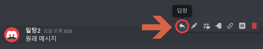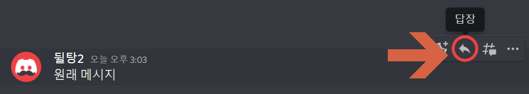 디스코드에서 답장을 다시려면 우선 답장을 달고 싶은 메시지 위에 마우스를 올려주세요. 그러면 오른쪽에 다음과 같이 할 수 있는 메뉴가 뜹니다. 여기서 화살표 모양 아이콘을 클릭해줍시다.