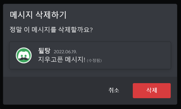 메시지 삭제를 누르면 다음과 같이 메시지를 삭제할지 다시 한번 물어보게 됩니다. 이 기능이 있어 실수로 메시지를 삭제하는 일이 줄어들게 되겠지요!