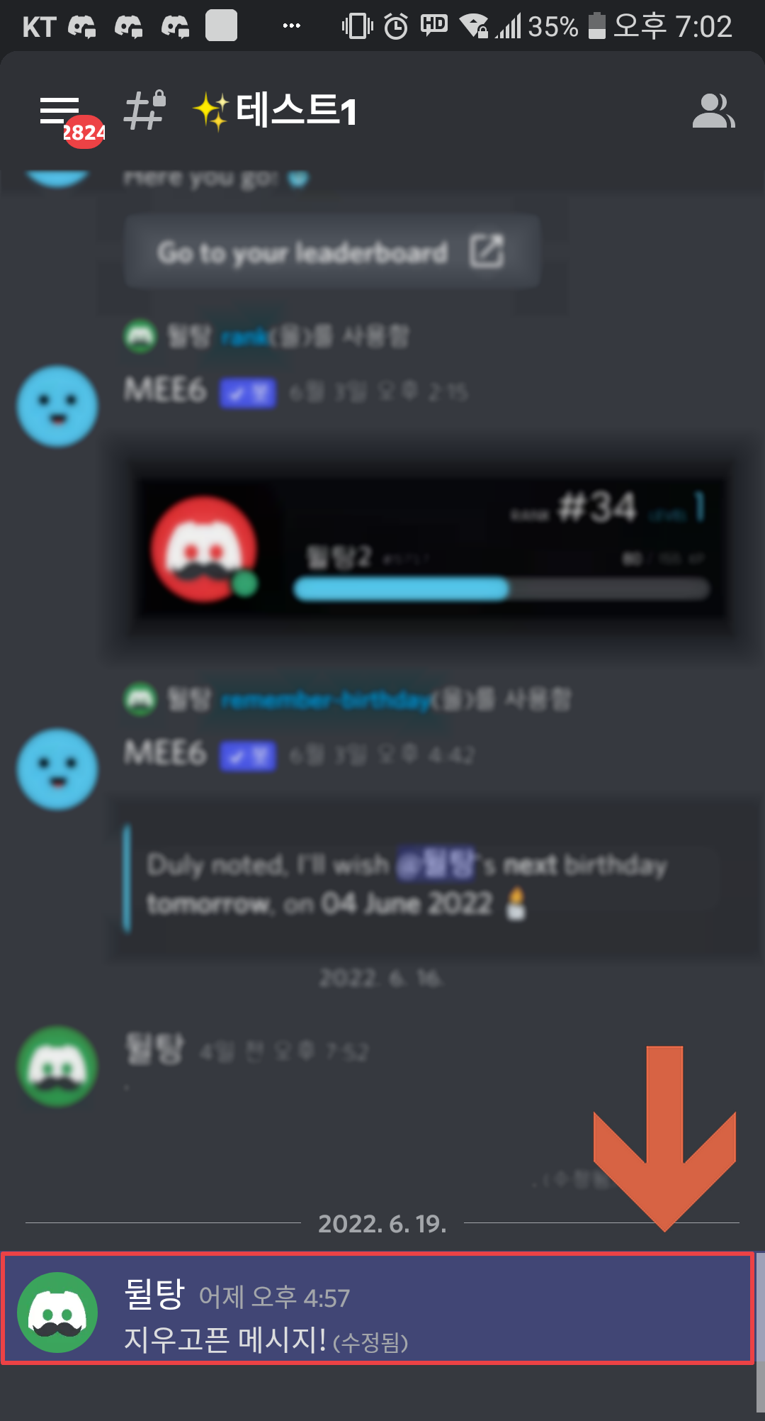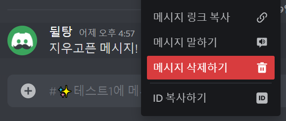 하지만 위 방법도 결국에는 삭제하고픈 메시지에 삭제 버튼을 일일히 눌러줘야 되기에 불편합니다. 하지만 봇을 이용하면 최근 대화 메시지를 한번에 정해진 숫자만큼 삭제하고, 특정 멤버가 적은 메시지만 삭제할 수 있지요!