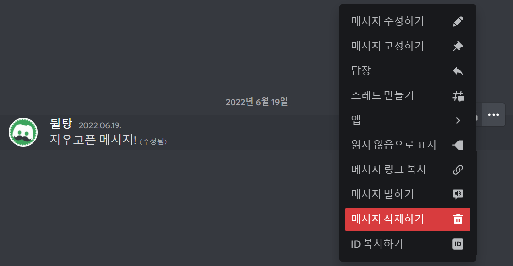 혹은 마우스를 올려놨을 때 오른쪽 메뉴에 점 3개(•••)가 있음을 확인하실 수 있습니다. 이를 눌러주면 다음과 같이 메뉴가 뜹니다. 여기서 메시지 삭제를 눌러주시면 됩니다!
