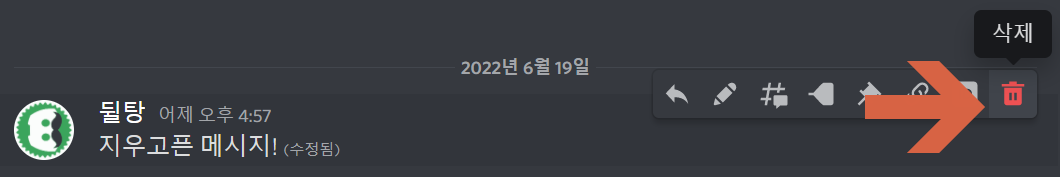 Shift를 눌린 상태에서 메시지 위에 마우스 커서를 올려두면, 오른쪽에 다음과 같이 추가 메뉴들이 생깁니다. 여기서 가장 오른쪽의 빨간 휴지통 모양 아이콘(🗑️)을 클릭해주시면 됩니다!