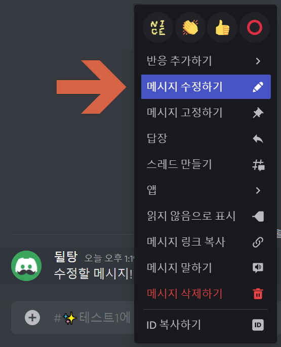 혹은 수정할 메시지에 우클릭을 한 다음 나온 메뉴에서 메시지 수정하기를 눌러주세요.
