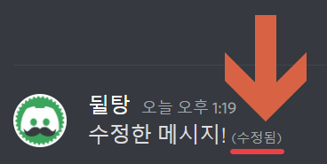 메시지 수정이 완료되면 다음과 같이 메시지 맨 오른쪽에 작은 회색 글씨로 '(수정됨)'이라 뜨게 됩니다! 이 표시를 보고 이 메시지가 수정이 됐었는지 확인할 수 있겠죠!