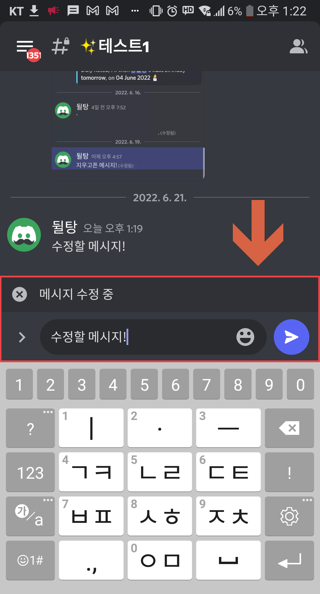 메시지가 수정 중이면 다음과 같이 화면이 바뀝니다! 여기서 원하는 대로 내용을 입력하신 후 Enter 키를 눌러 저장해주시면 됩니다! 혹은 Esc키를 눌러 메시지 수정을 취소할 수도 있어요.