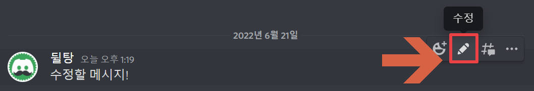 수정할 메시지가 있으면 그 위에 마우스를 올려보세요! 그러면 오른쪽에 다음과 같이 여러 아이콘이 생깁니다. 그중 연필 모양의 아이콘(✏️)을 클릭해주시면 됩니다!