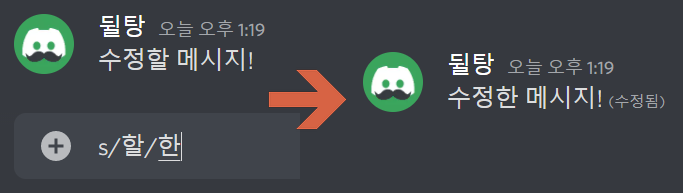 예전에 IRC 방식으로 수정하는 방식으로도 디스코드에서 메시지를 수정하실 수 있습니다. s와 슬래쉬(/)를 친 다음 위 메시지에서 수정할 부분을 입력해주세요. 그 후 다시 슬래쉬를 친 다음 수정하고픈 내용으로 입력해주세요. 그러면 다음과 같이 메시지가 수정이 됩니다! 이를 이용한 간단한 장난도 있어요.