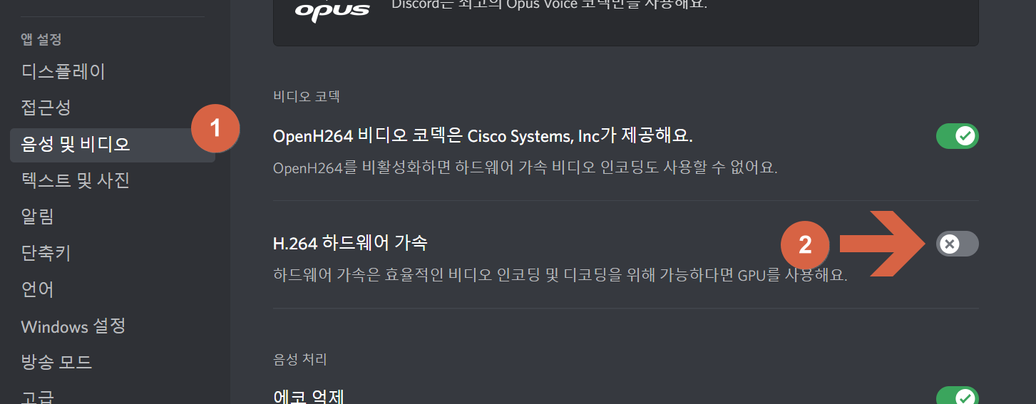그 후 왼쪽 메뉴의 앱 설정에 음성 및 비디오 설정에 들어가 줍니다. 그리고 비디오 코덱 항목을 찾아 H.264 하드웨어 가속을 꺼줍니다.