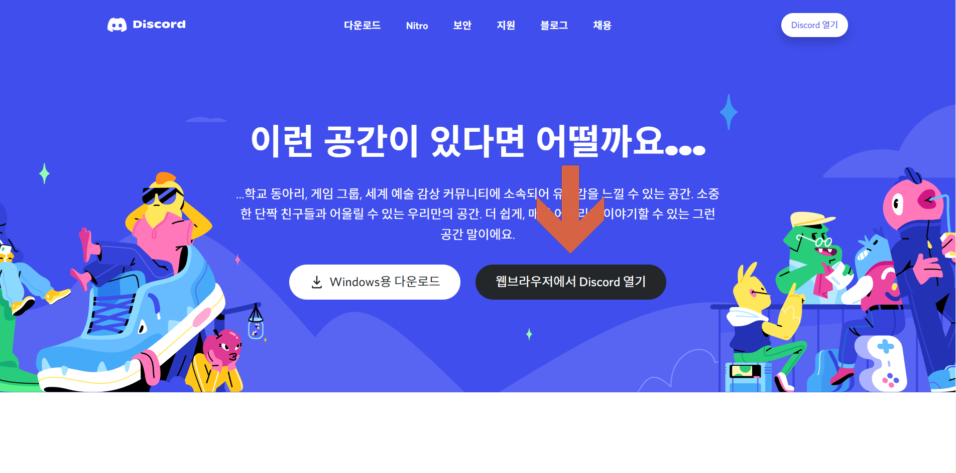 그래도 되지 않는다면, 웹 디스코드로 한번 접속해봅시다. 웹 디스코드는 https://discord.com/에 들어가 웹 브라우저에서 Discord 열기를 클릭해주시면 됩니다. 로그인 화면이 나오면 해주시고, 잘 되지 않았던 음성 채널에 다시 한번 들어가 줍시다.