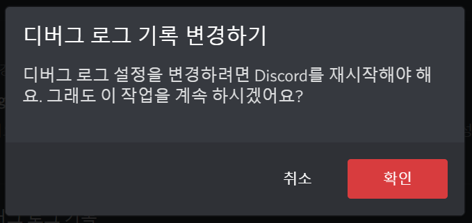 디버그 로그 기록을 해제할 때 다음과 같이 경고창이 뜨는데, 확인을 눌러주면 됩니다. 그러면 자동으로 디스코드가 새로 재시작을 합니다! 이후에는 롤이 랙걸리지 않게 됩니다.