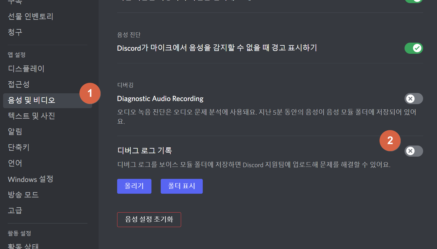 이후 왼쪽 메뉴에서 앱 설정 > 음성 및 비디오로 들어가 줍니다. 그 후 오른쪽에 뜬 창에서 맨 아래쪽으로 내려가면 디버그 로그 기록이 있습니다. 이것을 해제시켜주면 됩니다.