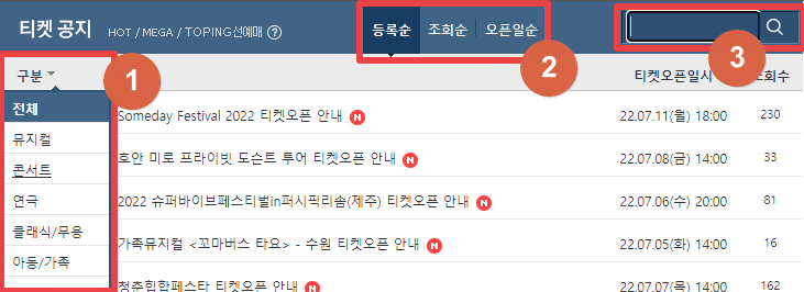 자신이 원하는 조건의 알림만 받고 싶으시면 우선 위 사이트에 들어가 줘서 옵션을 설정해줍시다. 그리고 설정 후 인터넷 url 주소를 복사해 메모해둡니다. 예를 들어 제주지역의 콘서트만 보고 싶으면, 1번 구분에서 콘서트를 선택하고 3번의 검색창에 제주라고 적어주시면 됩니다.