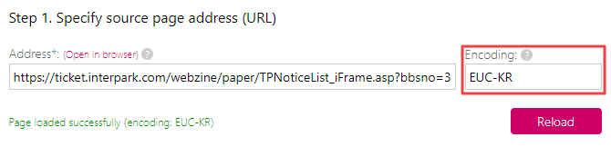 그리고 왼쪽에 아까 메모해뒀던 url 주소를 붙여넣어줍시다. 또 오른쪽 Encoding에는 무조건 EUC-KR를 입력해줍시다. 오른쪽 칸을 채우지 않으면 글씨가 깨져 알아볼 수 없게 됩니다. 다 입력하셨으면 아래 Reload를 눌러줍시다. 이때 왼쪽에 초록색 글씨로 무언가 뜨면 성공한 것입니다.
