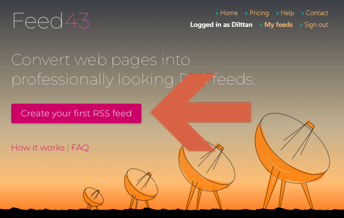 그 후 Feed43이라는 RSS 피드를 만드는 사이트에 들어가 줍시다. 이후 첫 화면에 Create your first RSS feed를 클릭해줍니다.