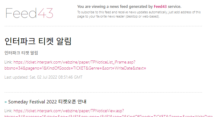 인터파크에서는 뮤지컬, 콘서트, 연극, 클래식, 무용, 스포츠 등의 티켓 등을 예매할 수 있지요. 이제 인터파크에서 올라오는 예매 소식들을 RSS로 알림 받아봅시다!