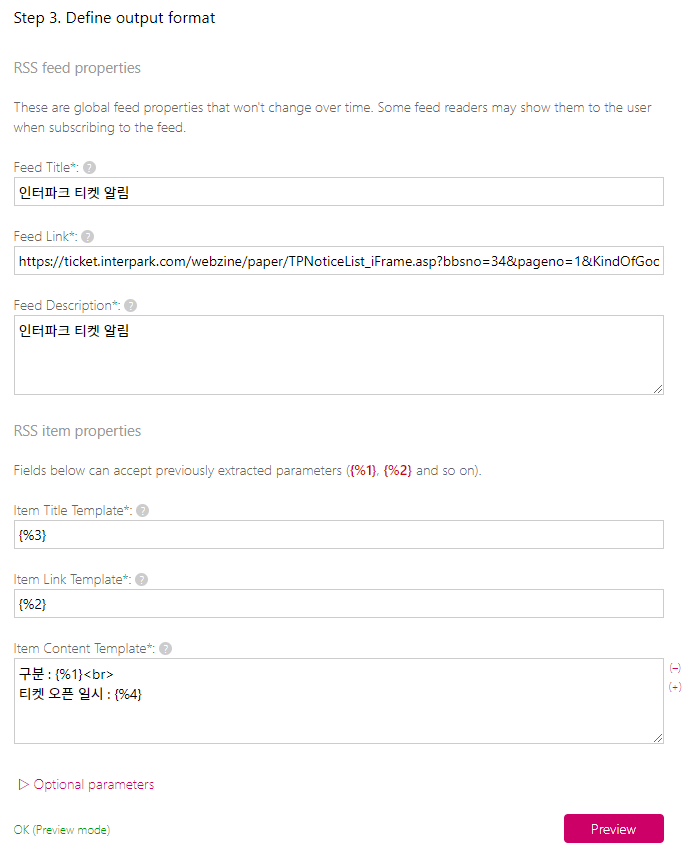 그리고 그다음 단계에는 위 내용과 그대로 똑같이 입력해주시면 됩니다. 그리고 마찬가지로 Preview를 눌러주세요.