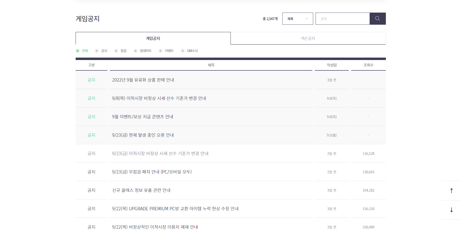 업데이트나 이벤트와 같이 사진이 붙어있는 페이지입니다.
