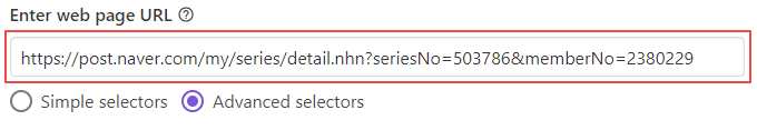 입력 내용 방식은 CSS 선택자를 따릅니다. 예를 들어 어떤 class를 가진 태그를 찾아주려면 (태그).(클래스 이름)으로 입력해주시면 됩니다. id로 하려면 # 뒤에 아이디 이름을 넣어주시면 됩니다. 추가로 (CSS 선택자는 아니지만) 어떤 요소의 내용을 뽑고 싶으면 (태그) @(요소명) 해주시면 됩니다.