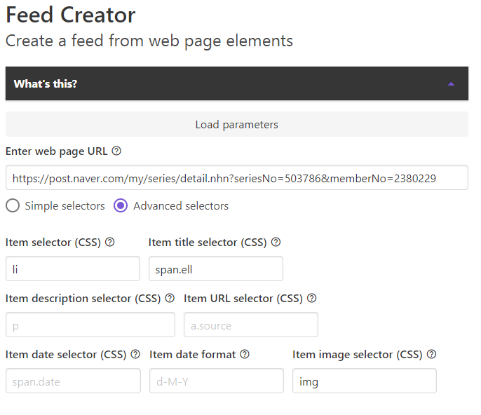 fivefilters 사이트에 들어가서 위쪽의 Load parameters를 클릭한 후