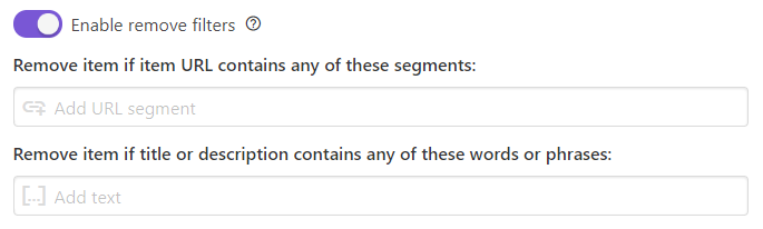 불필요한 부분을 지워서 깔끔하게 만드는 옵션입니다. 위쪽의 Source HTML은 없애고 싶은 태그를 입력하시면 됩니다. 여러 개를 지우고 싶으면 A, B처럼 콤마로 이어주세요. 아래쪽의 Item URL은 RSS의 url 항목에 파라미터들을 없앨지 선택하는 부분입니다. 1을 넣거나 비워두면 살리고, 0을 없애면 다 없앱니다. 파라미터 명을 콤마로 이어서 입력하면 입력된 파라미터만 살립니다.