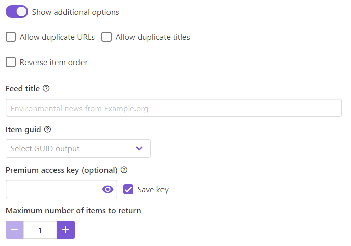 Feed title은 RSS 피드의 제목을 바꿔줍니다. Item guid는 어떻게 새 글을 판별할 것인지 옵션을 정해주는 듯 합니다. premium access key는 추가 결제 시에 사용하는 항목입니다.