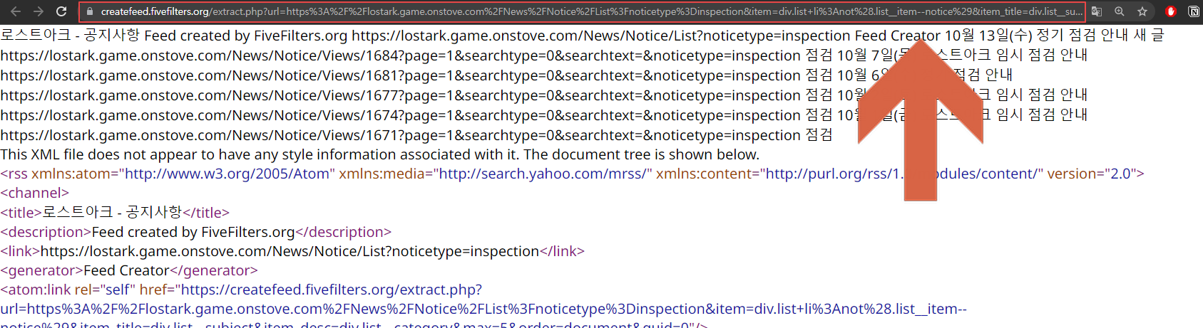 이 화면의 주소가 바로 RSS 피드 주소입니다! 이 주소를 RSS 리더기나 디스코드의 MonitoRSS 봇에 넣어주시면 됩니다.