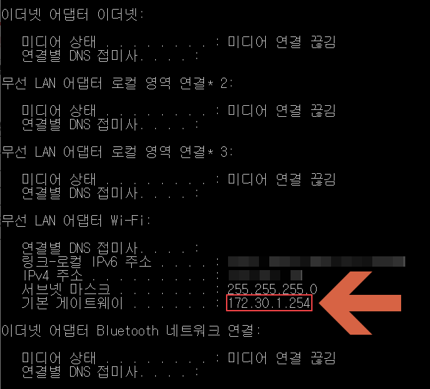 이 후 아래쪽에 기본 게이트웨이를 찾아서 오른쪽에 있는 ip 숫자들을 크롬 주소창에 그대로 입력해줍시다. KT의 경우에는 172.30.1.254입니다.