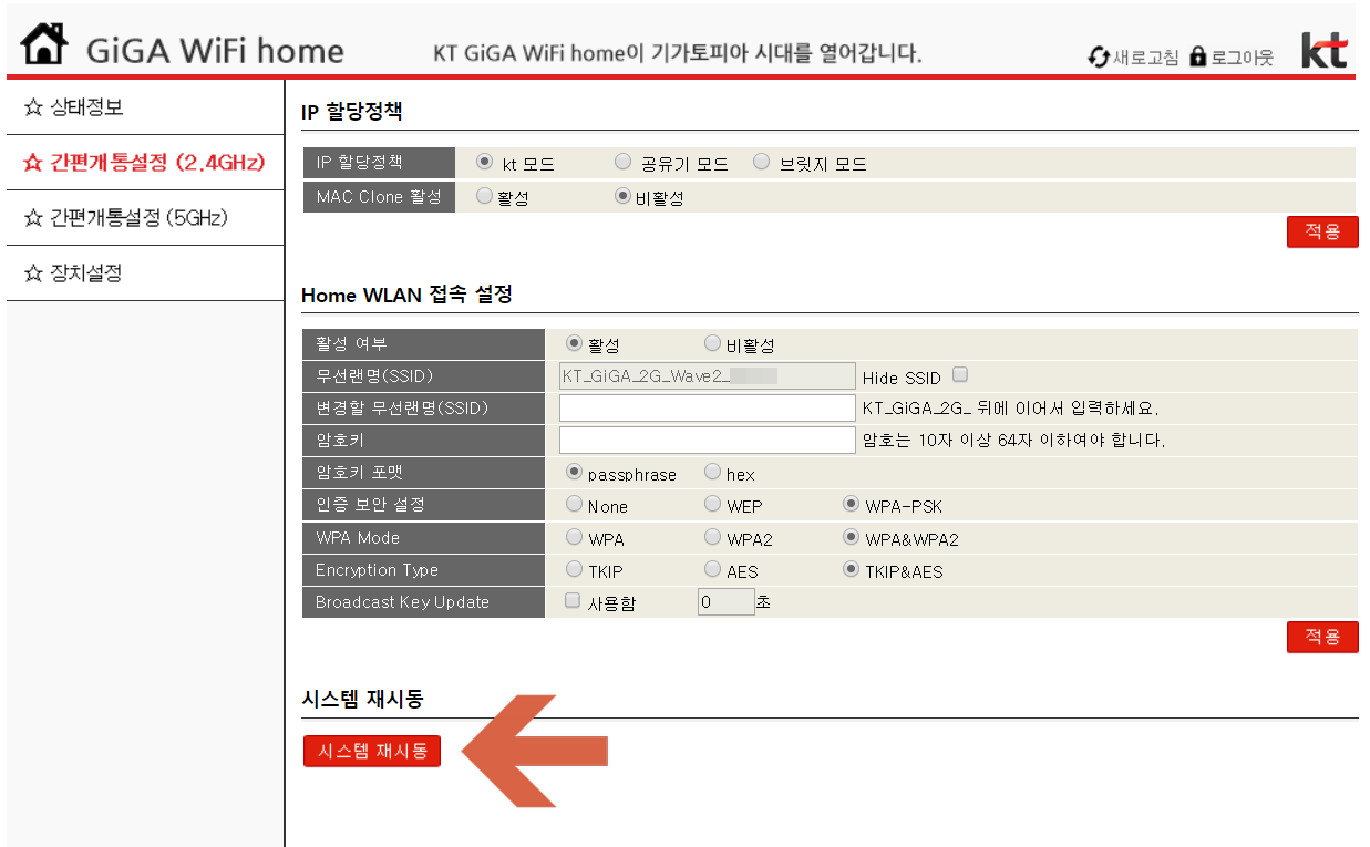 로그인을 하셨으면 개통설정에 시스템 재시동을 눌러주시면 됩니다.