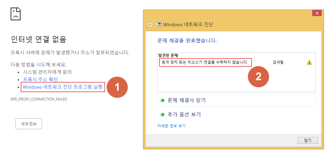 크롬에서 아무 사이트에나 들어가 왼쪽 화면이 뜨도록 해봅시다. 이 후 "Windows 네트워크 진단 프로그램 실행"을 눌러줍시다. 그러면 창이 뜨면서 네트워크를 진단하게 됩니다. 이 때 발견된 문제가 "원격 장치 또는 리소스가 연결을 수락하지 않습니다"일 때 쓸 수 있는 방법입니다.