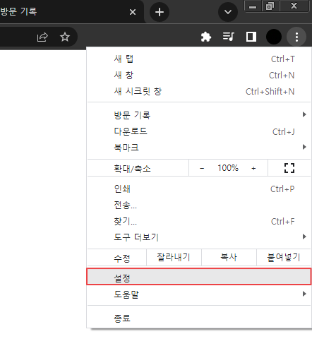 우선 크롬에 들어가서 오른쪽 위 점 3개 아이콘(⁝)을 클릭해 메뉴를 열어주세요. 그 후 설정으로 들어가주세요.