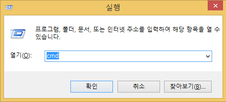 우선 윈도우 키 + R을 눌러서 실행을 열어줍니다. 그후 cmd라 입력 후 확인을 눌러줍니다.