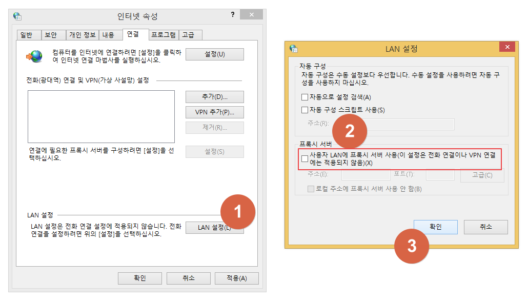 그 후 연결 탭에서 아래쪽의 "LAN 설정"을 눌러주세요. 창이 하나 뜨면 "사용자 LAN에 프록시 서버 사용(이 설정은 전화 연결이나 VPN 연결에는 적용되지 않음)"을 체크 해제를 해주세요. 그 후 확인 버튼을 눌러 적용시켜주시면 됩니다.