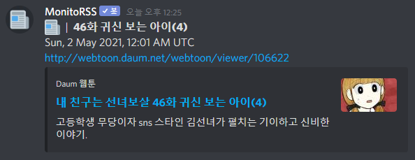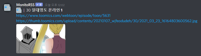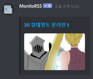 MonitoRSS 봇을 쓰실 경우 위의 투믹스와 마찬가지로 설정해주시면 됩니다!