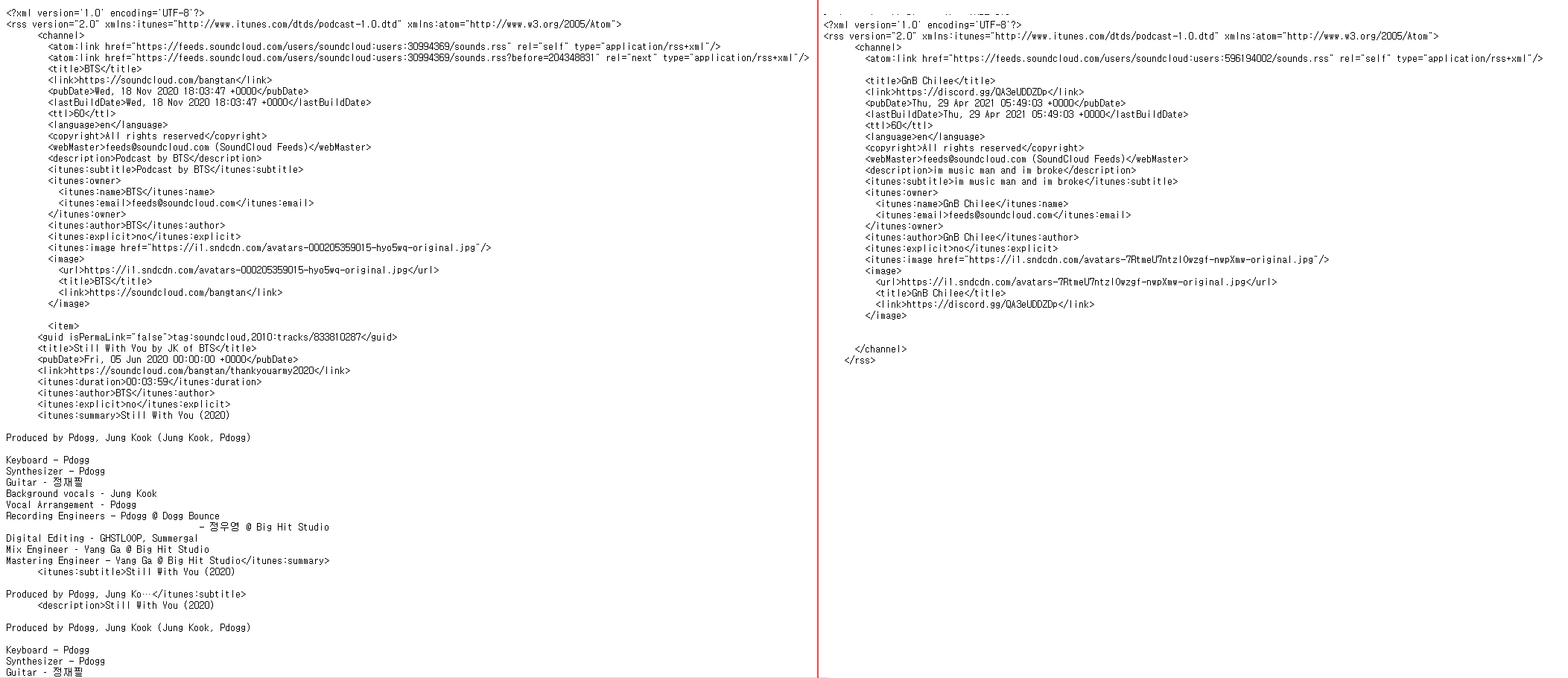 그 숫자를 위의 형식에 붙여넣어 주시면 다음과 같이 BTS 사운드클라우드의 RSS 주소가 뜹니다!
