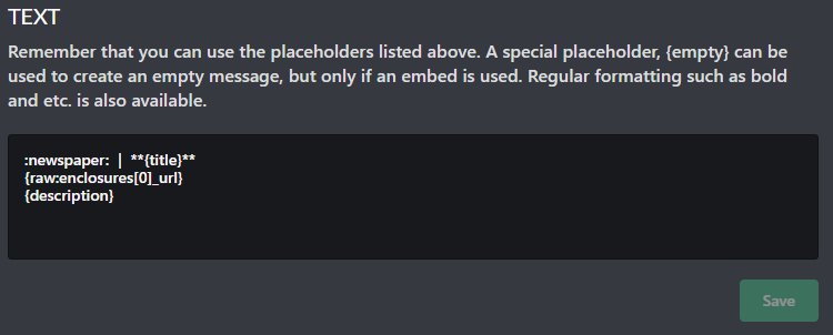 만약 MonitoRSS를 쓰신다면 Messege항목의 Text를 다음과 같이 설정하시면 mp3주소까지 표시돼서 좋습니다!
