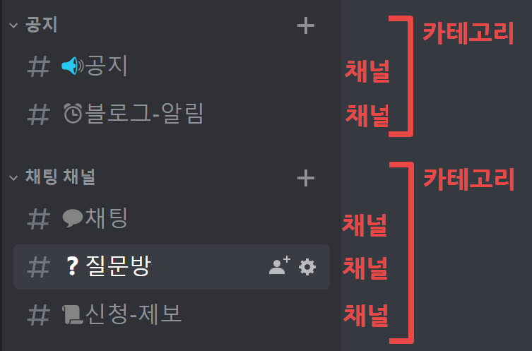 카테고리는 채널들을 담고 있는 폴더입니다. 여러 채널들을 하나로 묶어줍니다. 나중에 역할 설정 등 관리가 편해지기 때문에 관련있는 채널들은 카테고리로 묶어두는 것이 좋습니다.