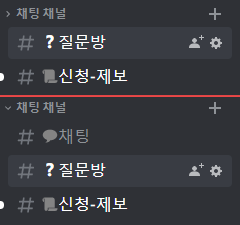 카테고리는 클릭해서 접었다가 펼 수 있습니다. 접었을 경우에는 카테고리명 좌측의 아이콘 모양이 > 모양으로 변하며 위와 같이 현재 들어가 있는 채널과 새 글이 있는 채널만 보이게 됩니다. 새 글이 있는 채널은 제목이 흰색으로 변하면서 좌측에 작은 삼각형(▶)이 뜹니다. 펼쳤을 경우 이름 옆 아이콘의 모양이 90도 돌린 듯이 변하며 모든 채널이 보이게 됩니다. (보통 디스코드에서 보이던 채널이 갑자기 안 보인다면 카테고리를 접어놓았을 경우가 많습니다.)