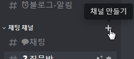 특정 카테고리에 채널을 추가하고 싶다면 카테고리 옆의 +표시를 클릭해주세요. 새로 만들어진 채널은 그 카테고리에 바로 들어가게 됩니다.