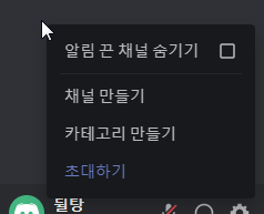 다른 방법으로는 채널 목록의 빈 부분에 마우스 우클릭을 해보세요. 그러면 아까와 마찬가지로 채널 만들기, 카테고리 만들기가 뜹니다.
