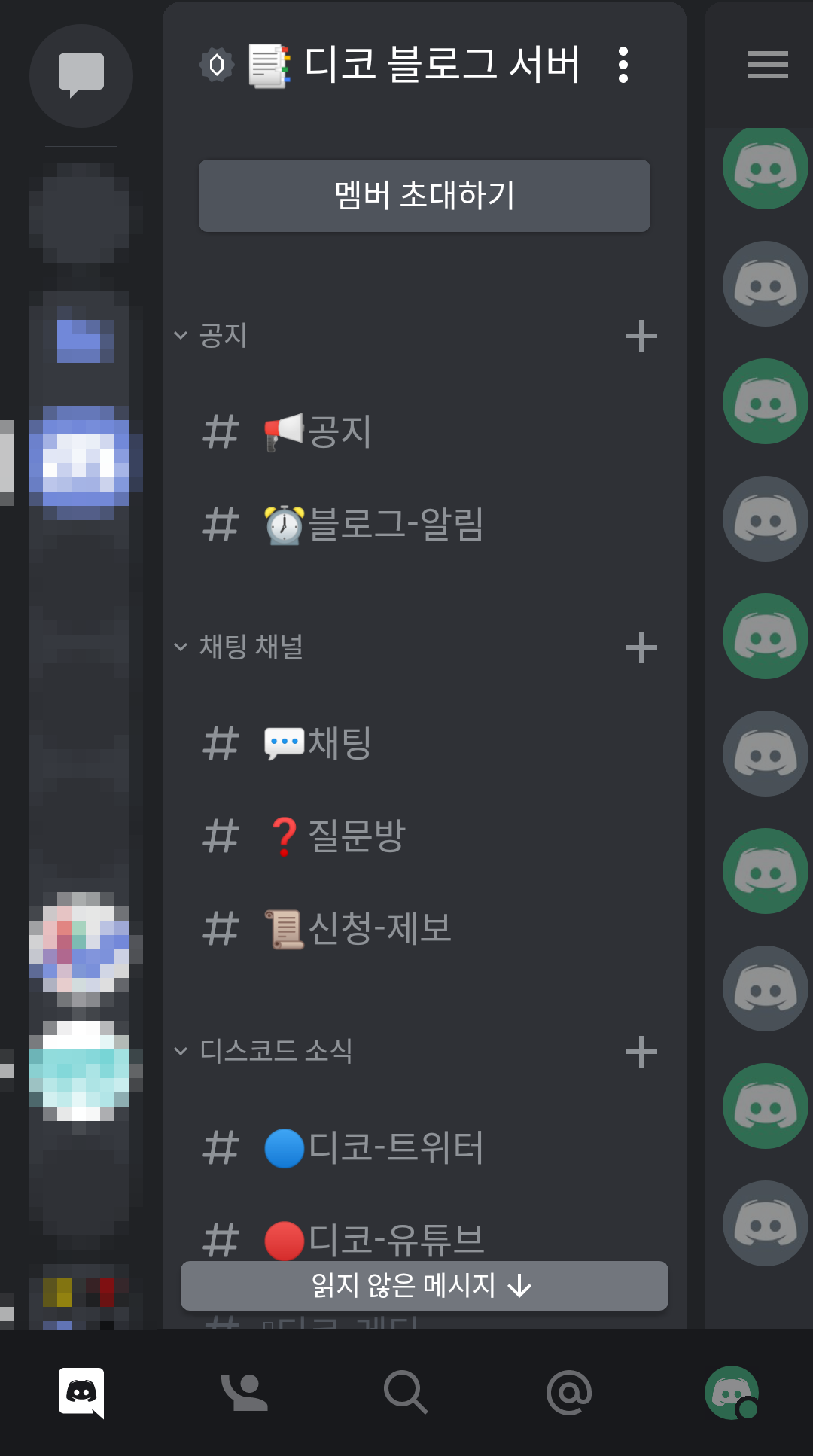 모바일에서는 화면을 왼쪽에서 오른쪽으로 한번 쓸어주세요. 그러면 다음과 같이 서버 목록과 채널 목록이 보입니다. 반대로 오른쪽에서 왼쪽으로 쓸어주면 채팅 화면으로 돌아옵니다.
