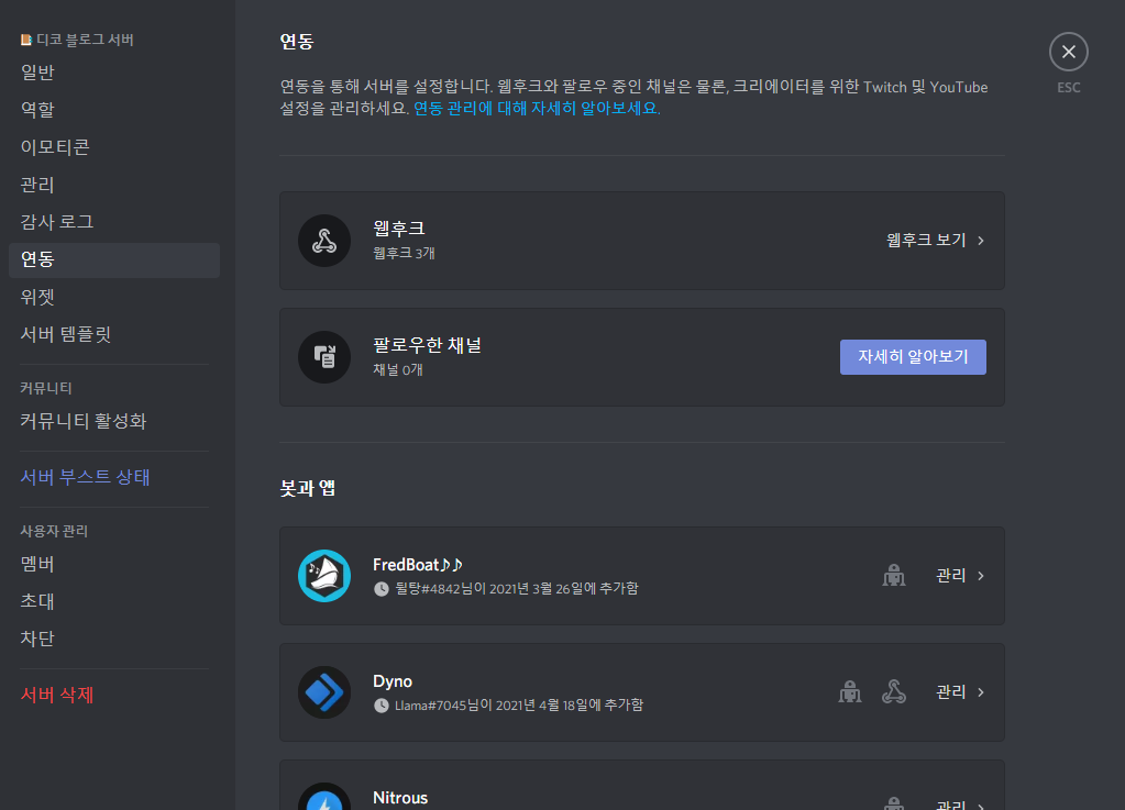 똑같이 연동으로 들어가보시면 아까와 똑같이 있던 웹후크 이외에도 아래에 봇과 앱이 추가된 것을 확인할 수 있습니다.