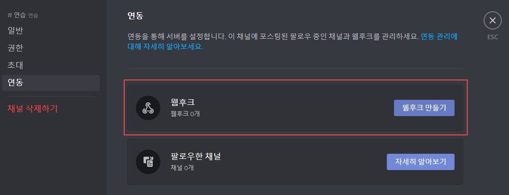 채널에 웹훅 만들기